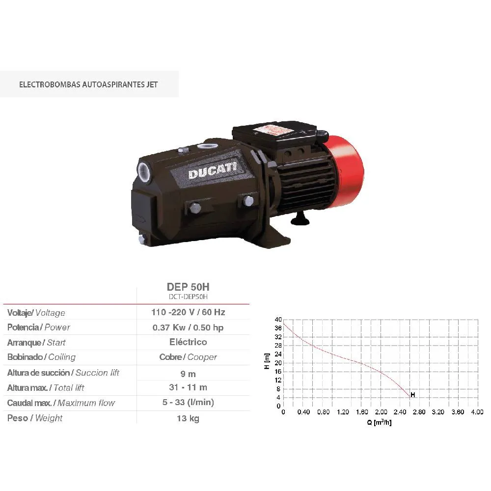 - La Electrobomba de Jet Autosebante Ducati DEP50H es una herramienta de alta eficiencia diseñada para satisfacer las necesidades de bombeo de agua en aplicaciones domésticas y pequeñas instalaciones. Con una potencia de 0.5 HP (0.37 kW) y un motor 100% cobre, esta bomba garantiza un funcionamiento duradero y eficiente, asegurando una mayor resistencia al desgaste y una vida útil prolongada.