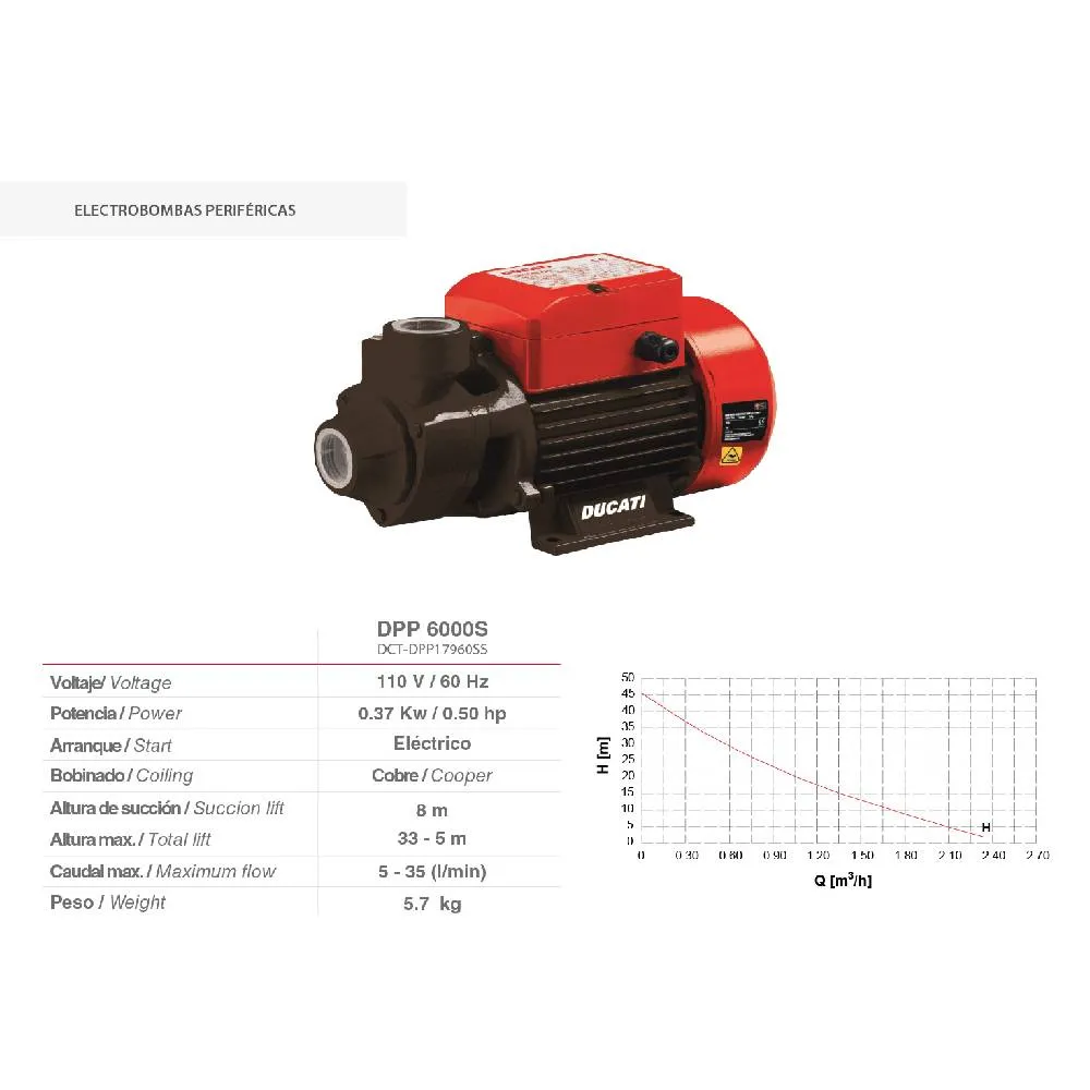 - La Electrobomba Periférica Ducati DPP6000S es una excelente elección para quienes buscan eficiencia, durabilidad y un rendimiento constante en el bombeo de agua. Diseñada especialmente para aplicaciones domésticas y pequeñas instalaciones, esta bomba es ideal para alimentar sistemas de riego, abastecer viviendas desde pozos o cisternas, o realizar trasvases en entornos donde se requiere un caudal confiable y una presión estable.