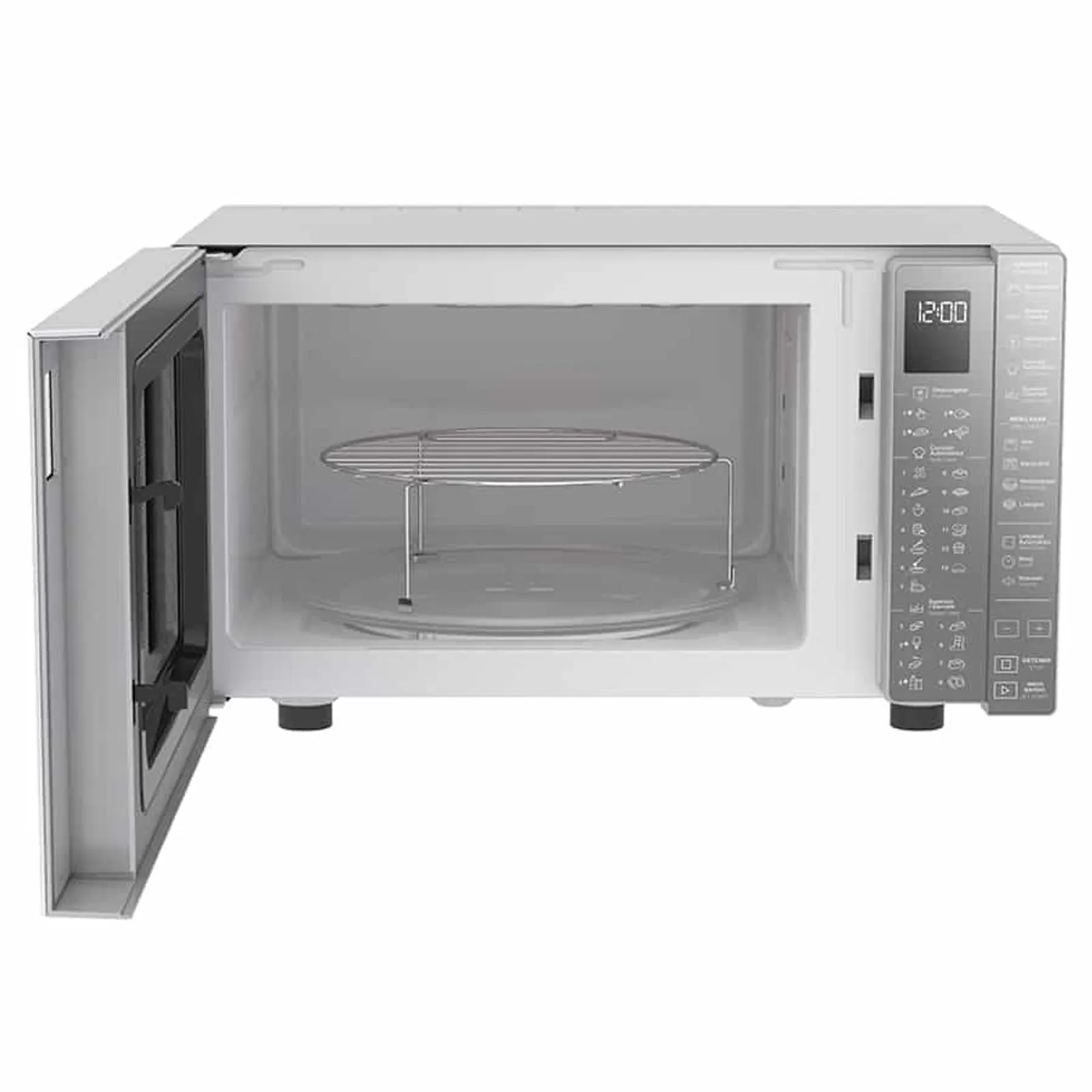 Microondas de mesa 30 Lts. Color Silver con Acabado Espejo con 25 funciones preprogramadas + funciones especializadas (mantener caliente y limpieza automática) control Electrónico touch, 7 niveles de potencia, Suavizar/Derretir. Cuenta con Función Grill con 1050 W de potencia, además de Cocción automática, inicio rápido +30 segundos, reloj, display LCD, iluminación incandescente interior y plato giratorio. Además, de su función de Limpieza Automática, cuenta con función de Mantener Caliente, Descongelar Manual. Pizza, Bebidas, Arroz, Pescado y Palomitas, y recubrimiento protector de polvo.